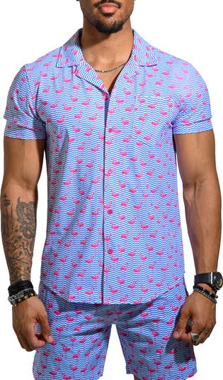 Flamboyances of flamingos stand in ocean-blue angles on a camp shirt made for standing, sitting or having fun in the softness of breathable cotton. Wear it on its own or layered and unbuttoned to change up your look without losing your comfort.