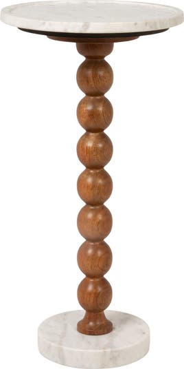 - A round accent table featuring a white marble top and base with gray veining, connected by a sculptural column of stacked honey walnut-finished wooden spheres