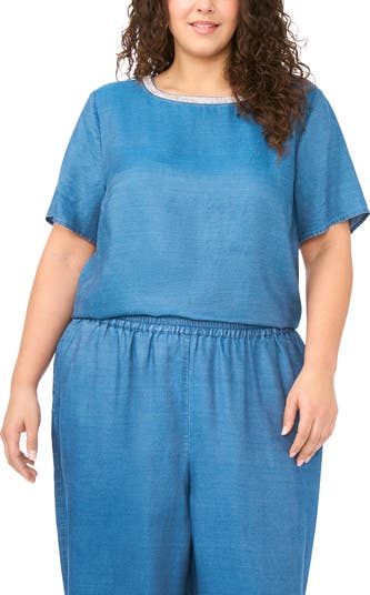 Lustrous embellishments trim the neckline and add a dose of glam to a chambray top featuring a boxy silhouette that offers versatile styling options.