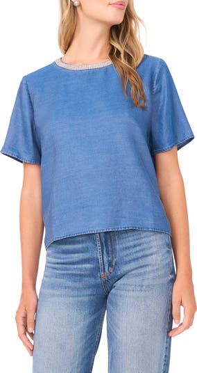 A soft chambray top adds a bit of bling at the jewel neckline.