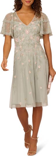 Twinkling beads and sequins light up a gorgeous cocktail dress in a classic A-line silhouette with flouncy ruffle-trimmed short sleeves.