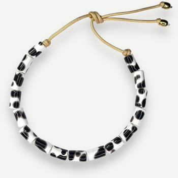 Gloss ceramic beads with natural detailing are strung on a gold cord with knotted cording and brass ends for a statement look, finished with an adjustable length for a customizable fit. The perfect statement piece.