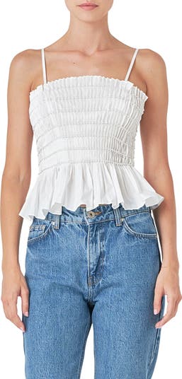 Take on elevated sunshine style in this lightweight cotton camisole with clear beads detailing the sharp pleats, while a flouncy peplum frills the waist.
