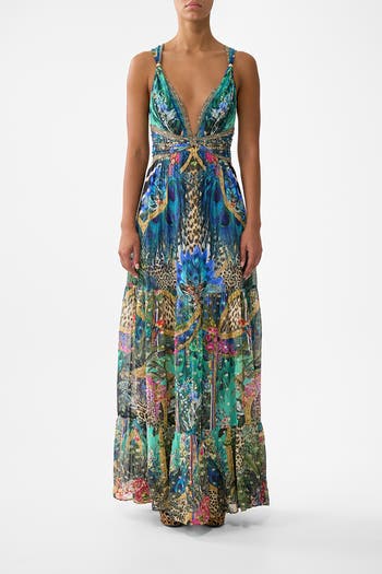 Inspired by the majesty of the animal kingdom, the Animal Alchemy Bead Strap Gathered Panel Dress is a handcrafted silhouette designed by our in house artisans. Reimagined in an exclusive limited edition print, this luxury maxi dress features a plunging neckline that falls into a softly gathered skirt with panels. The straps are adorned with hardware details which meet waist shirring at the back for effortless comfort. It's finished with intricately placed crystal embellishments, for luminous detail.