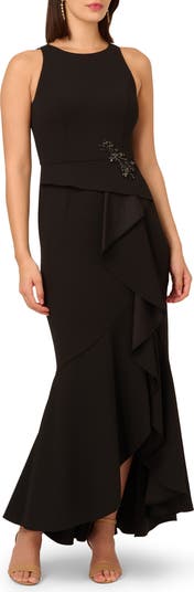 Feel your most dazzling in this dramatic gown featuring a beaded appliqué and a cascading ruffle skirt that's perfect for dancing the night away.