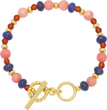 Lapis lazuli, red agate and rhodoscrite bring vibrant color to this stackable bracelet glinting with golden stations.