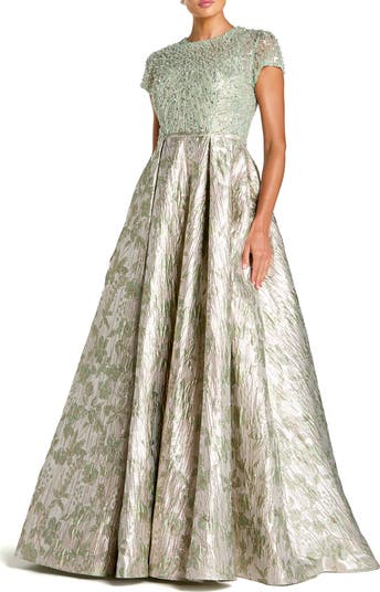 Beaded Cap Sleeve Ball Gown with Metallic Brocade Skirt