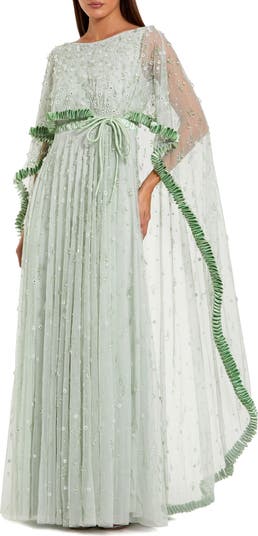Beaded Cape Sleeve Gown with Ruffled Trim Detail