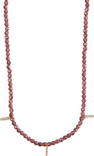 Garnet beads line this stackable necklace highlighted by a trio of sterling silver charms plated in 18-karat gold and lined with cubic zirconia.