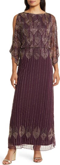Shiny beads sparkle all over this cold-shoulder cocktail dress in a flowy blouson silhouette that goes anywhere with ease.