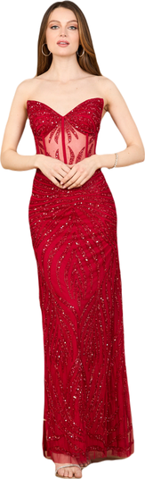 This dazzling dress features intricate beadwork and a corset design for a figure-flattering fit. The sheer bodice adds a touch of allure, while the side slit allows for easy movement on the dance floor. Be the belle of the ball in this stunning gown!