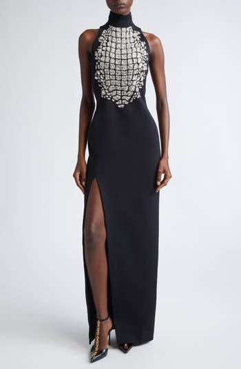 Sparkling crystals and glittering beads are arranged in a crocodile scute-inspired pattern, bringing a modern armor aesthetic to this sleek gown tailored in a curve-hugging silhouette with a thigh-high slit. The turtleneck and cutaway shoulders are the perfect balance to the floor-grazing length.