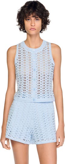 Sleeveless crochet cardigan decorated with beads, featuring round neck and geometric pattern.
