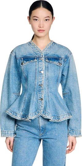 Denim jacket embellished with pearls, featuring a peplum hem, long sleeves and a front button fastening.