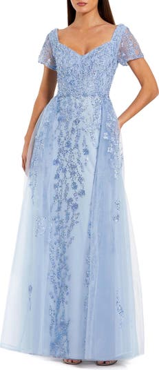 This cap-sleeve gown features beaded embroidery and a stunning overskirt, creating a glamorous and sophisticated silhouette for any special occasion.