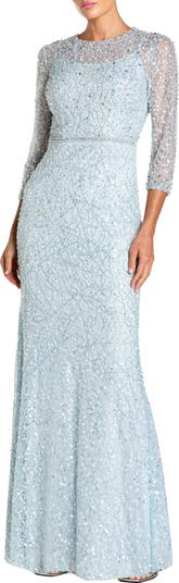 Elegant beaded mesh gown with an illusion neckline, sheer 3/4 sleeves, and a defined waist, finished in a sleek floor-length silhouette.