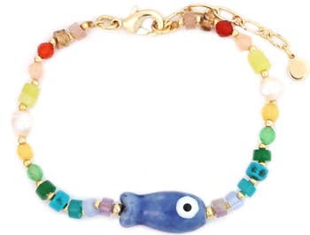 A wide-eyed fish charm adds playful personality to this colorful beaded bracelet.