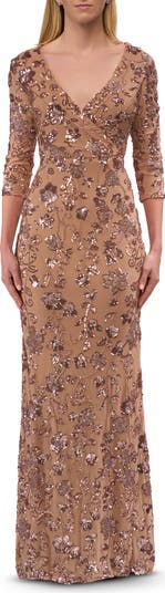 Fabulous stretch jersey gown with beaded sequin floral design. The dress features a V neckline and three quarter sleeves. Back zipper closure.