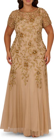 Handsewn beading adds a glittering garden to the winsome aesthetic of this softly pleated gown finished with a frothy skirt.