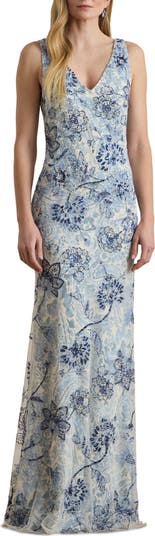 Beaded blooms backed by pretty paisley define a winsome gown offered in a classic bias cut.