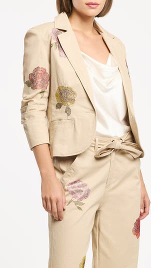 Beaded blooms jazz up a stretch-cotton jacket designed with permanently pushed-up sleeves and a shrunken silhouette.