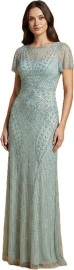 Step into charm with this beaded flutter sleeve sheath wedding gown, designed for the mother of the bride or groom who loves modest elegance with a playful twist. Delicate beadwork adds sparkle while flutter sleeves bring light, whimsical movement