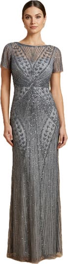 Step into charm with this beaded flutter sleeve sheath wedding gown, designed for the mother of the bride or groom who loves modest elegance with a playful twist. Delicate beadwork adds sparkle while flutter sleeves bring light, whimsical movement