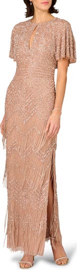Intricate beading and wispy fringe detailing lend party-ready drama to this flutter-sleeve column gown made with a daring side slit.
