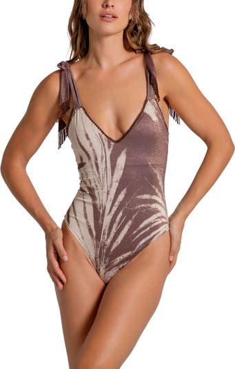 Fringe-trimmed tie straps top this bead-detailed metallic one-piece swimsuit that's perfect for poolside moments and beachy vacations alike.