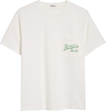 From Bode's tribute to American composer Moose Charlap, this cotton pocket tee is decorated with a beaded homage to a Poconos summer camp, where Charlap was a music counselor as a teenager.