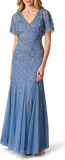 Shimmering sequins and beads adorn an elegant evening gown with a blouson bodice and flowy sleeves.