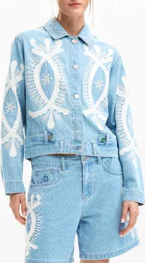 Upturned jeans define the style of a trucker jacket that trades toughness for whimsy with delicately decor and a playful mix of mismatched buttons.