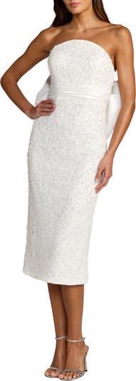 Elegant strapless beaded lace midi dress with pearl and sequin detailing, a satin waistband, and an oversized bow back for timeless sophistication.