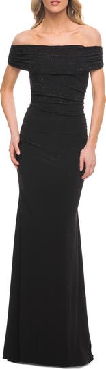 Beaded jersey gown with ruched off the shoulder top. Back zipper closure.