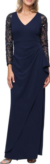 Glittering beadwork styles the sheer sleeves of a columnar gown offered in a classic shade.
