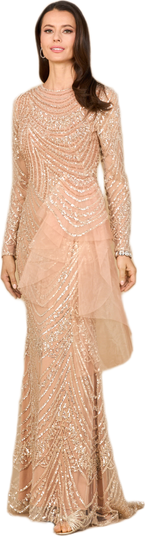 This elegant mermaid gown boasts long sleeves, a high neckline, and a figure-hugging silhouette that accentuates your curves. The waist is adorned with a large tulle applique for a touch of glamour and flair.