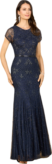 Cap sleeve gown featuring a high neck and a mermaid skirt. A classic look with a new embroidered twist makes this a staple for any closet.