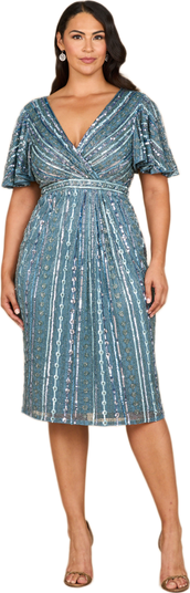 Turn heads at your upcoming cocktail wedding event with this chic midi dress that showcases a dazzling v-neckline, intricate beading, and fluttering cap sleeves. The belted waist adds a touch of sophistication and complements all body shapes. Stand out in this unique and fashionable dress!