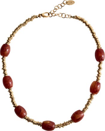 Polished metal discs bring intricate shine to a necklace stationed with oversize acrylic beads.