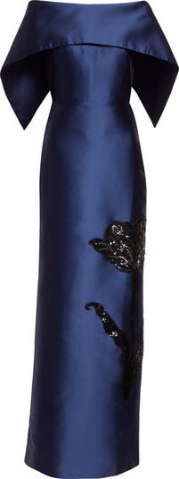 Heavyweight mikado with a satiny sheen and a touch of silk lends itself to the sculpted design of this slim midnight-blue gown appliquéd with a long-stemmed tulip portrayed in sequins, crystals and beads. A wide flared band frames the off-the-shoulder neckline and swoops down into dramatic points in back for a striking finish.
