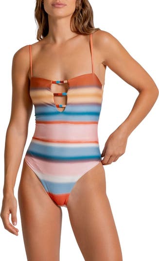 Bead-trimmed ladder details center the front of this colorful one-piece swimsuit that hugs your curves as you lounge by the water with confidence.