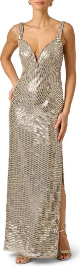 Mirrored beading forms a geometric swirl motif on elegant evening gown that shimmers from every angle.