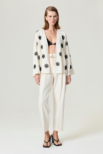 Make an unforgettable entrance in this relaxed-fit kimono, featuring intricate allover beaded motifs that shimmer with every move. Designed with wide, flowing kimono sleeves and an open front, the drapey silhouette offers effortless elegance. Crafted from lightweight crepe and left unlined for maximum movement, it's the ultimate layering piece for evening allure or elevated daytime looks.