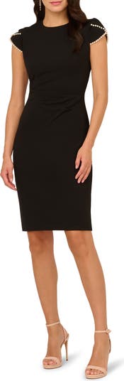 Transition flawlessly from day to night in this sophisticated figure-skimming sheath framed by elegant pearly beads and lovely layered cap sleeves.