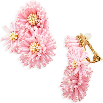 Beaded Pompom Flower Clip-On Earrings