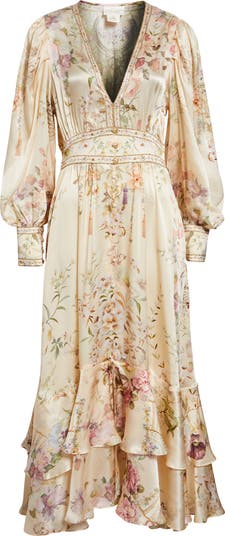 Created in an exclusive limited-edition print, this creamy floral silk dress features a deep V-neck and fitted waistband with elastic in back for comfort and a custom fit. Glints of shine reflect from the crystal beading at the neckline and waist, while balloon sleeves and a softly flounced high-low skirt accentuate the satiny sheen of the charmeuse fabric.