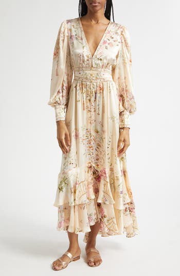 Created in an exclusive limited-edition print, this creamy floral silk dress features a deep V-neck and fitted waistband with elastic in back for comfort and a custom fit. Glints of shine reflect from the crystal beading at the neckline and waist, while balloon sleeves and a softly flounced high-low skirt accentuate the satiny sheen of the charmeuse fabric.