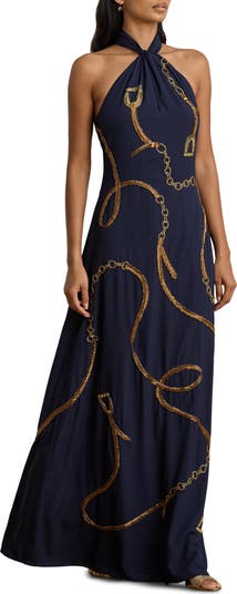 Rope-inspired beading and shimmering sequins lend coastal elegance to this halter gown fashioned with a front keyhole and a floor-skimming skirt.