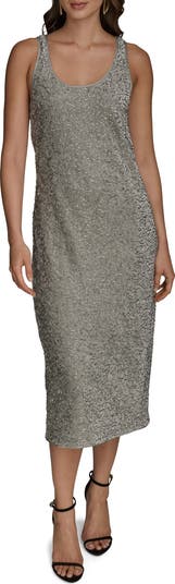 A confetti-like cascade of shimmering beads adds unmistakable glamour to this party-ready sleeveless dress.