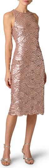 Swirled in sparkle and eased with a scalloped hem, this toastworthy midi dress is sure to enchant everyone's evening.